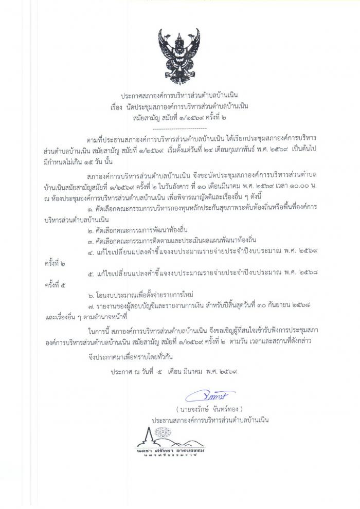 นัดประชุมสภา อบต.บ้านเนิน สมัยสามัญ สมัยที่ 1/2569 ครั้งที่ 2