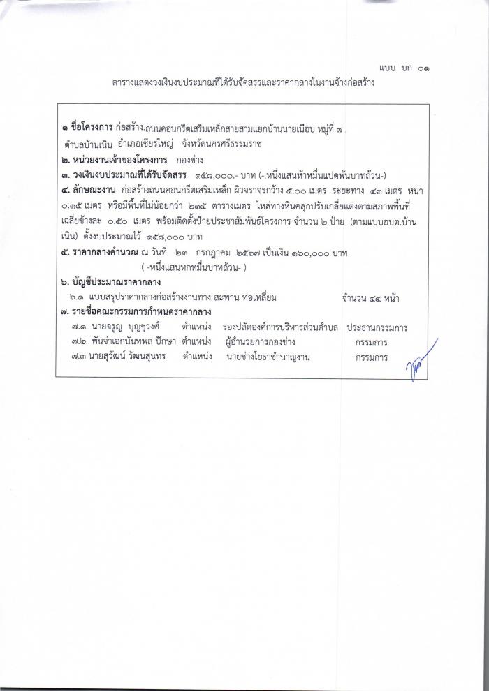 ประกาศราคากลางก่อสร้างถนนคสล.สายสามแยกบ้านนายเนือบ หมู่ที่๗ ต.บ้านเนิน