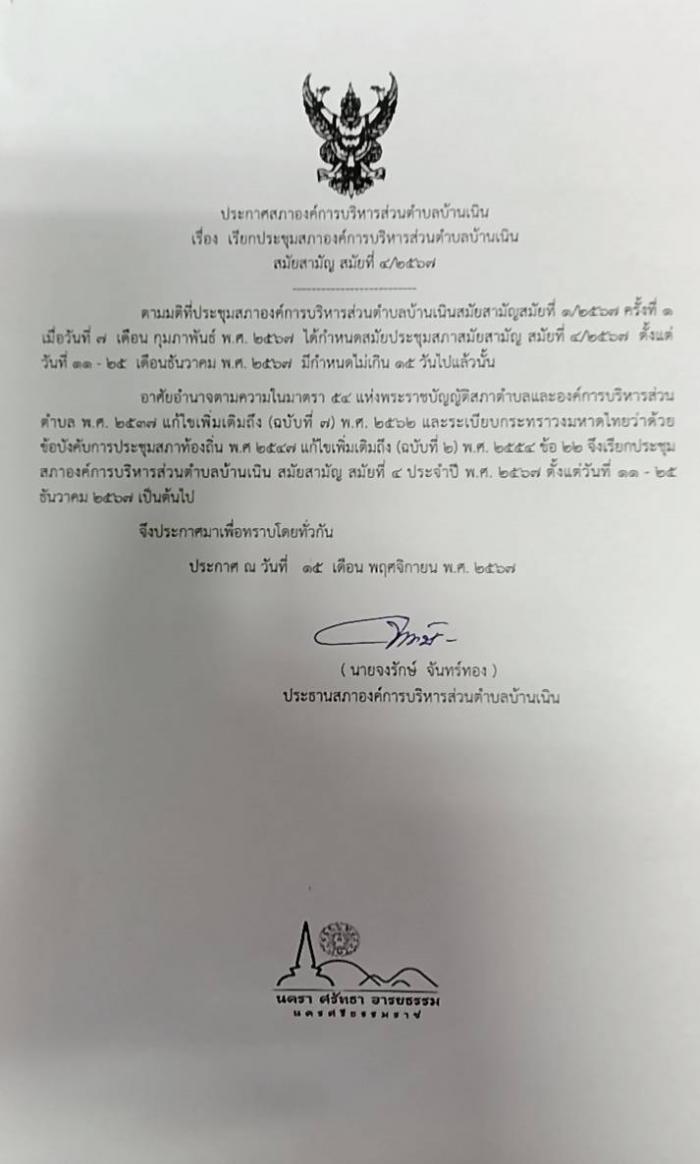 เรียกประชุมสภา อบต.บ้านเนิน สมัยสามัญ สมัยที่ 4/2567