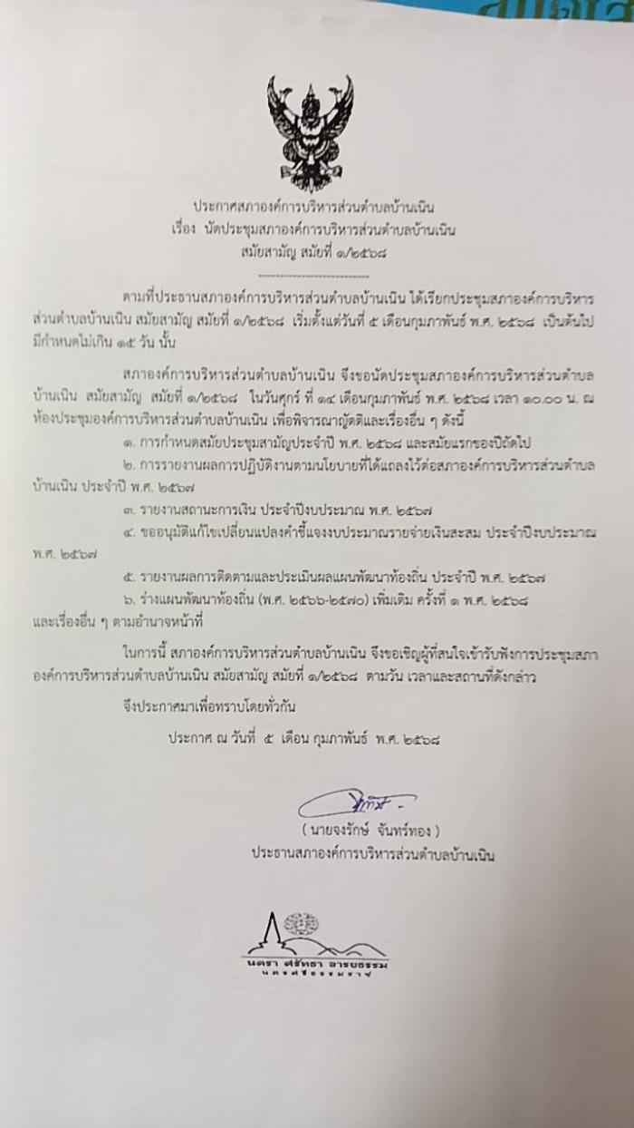 นัดประชุมสภา อบต.บ้านเนิน สมัยสามัญ สมัยที่ 1/2568