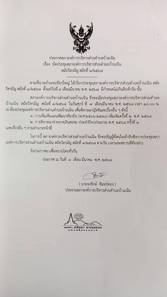 นัดประชุมสภา อบต.บ้านเนิน สมัยวิสามัญ สมัยที่ 1/2568