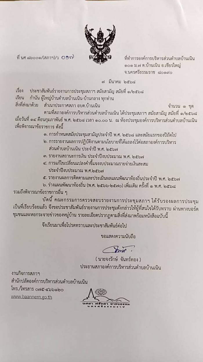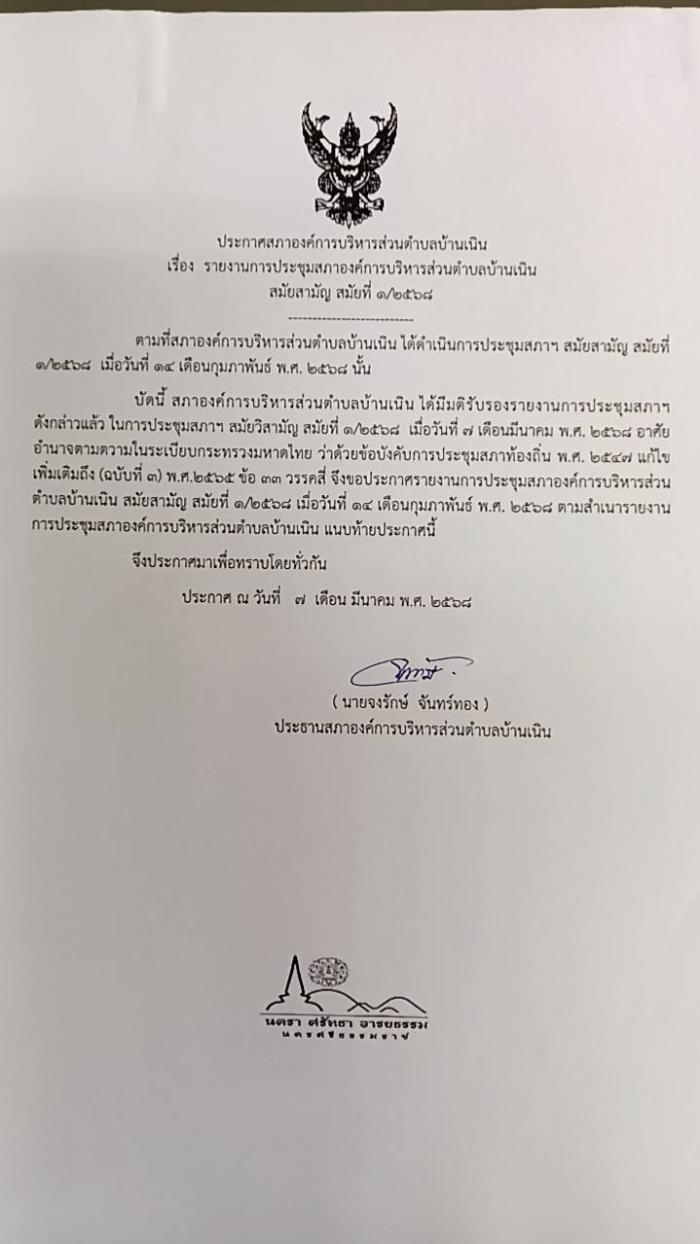 ประชาสัมพันธ์รายงานการประชุมสภา อบต.บ้านเนิน สมัยสามัญ สมัยที่ 1/2568