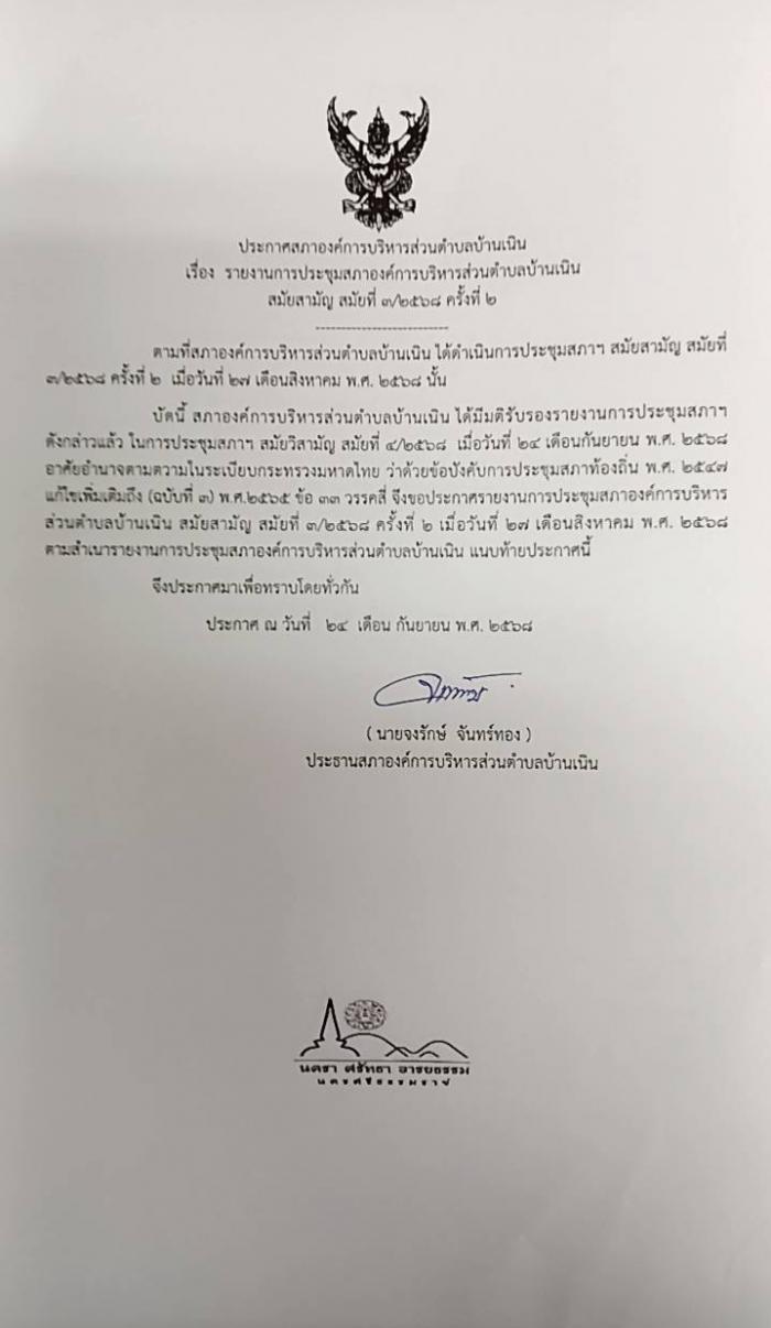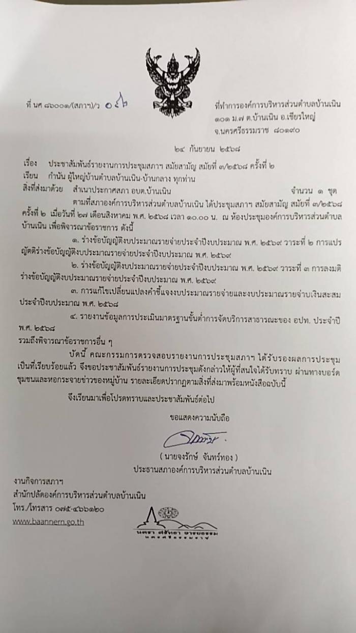 ประชาสัมพันธ์รายงานการประชุมสภา อบต.บ้านเนิน สมัยสามัญ สมัยที่ 3/2568 ครั้งที่ 2