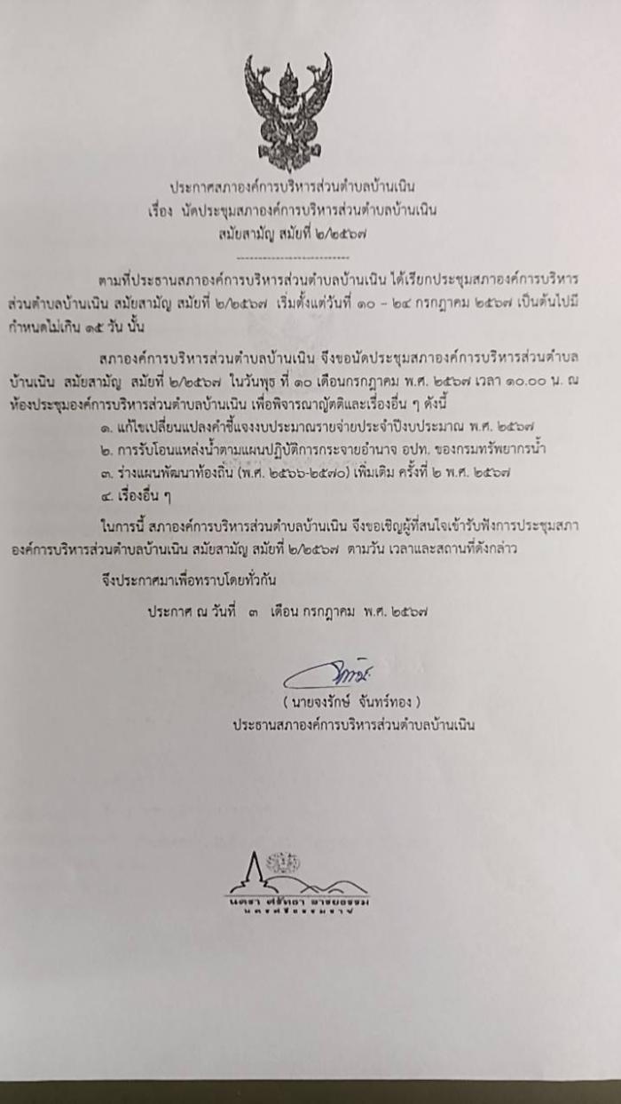 นัดประชุมสภา อบต.บ้านเนิน สมัยสามัญ สมัยที่ 2/2567