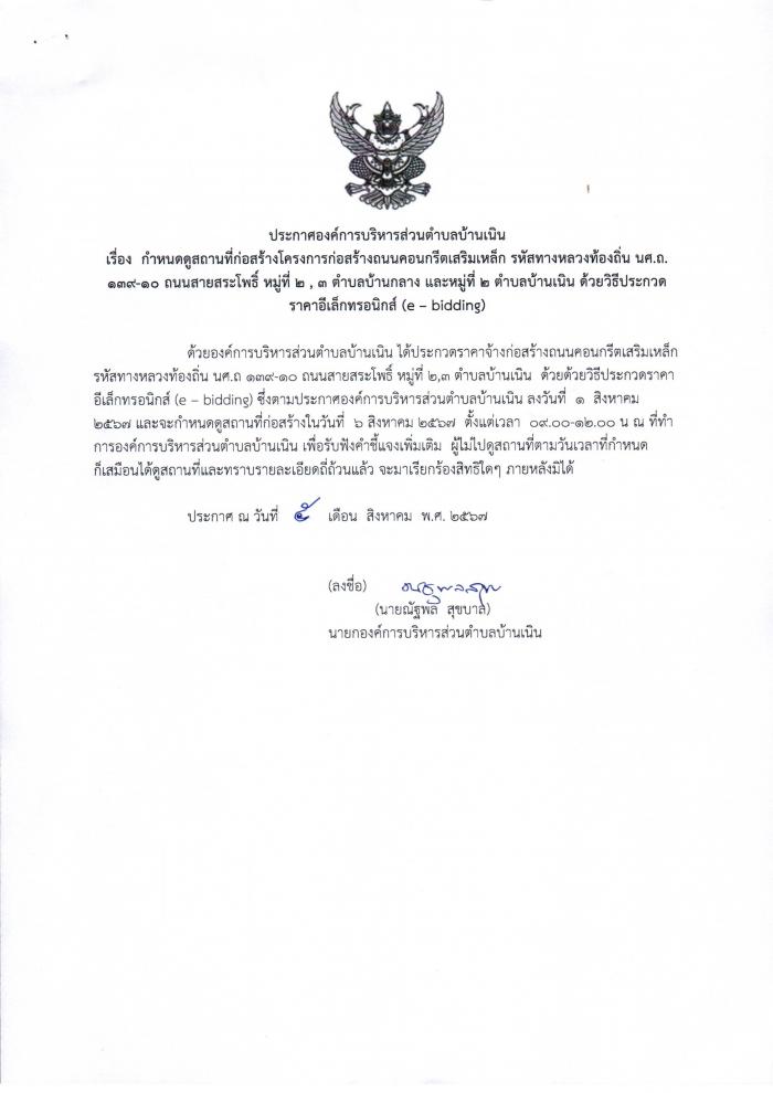 ประกาศองค์การบริหารส่วนตำบลบ้านเนิน เรื่อง กำหนดดูสถานที่ก่อสร้างถนนคสล.รหัสทางหลวงท้องถิ่น นศ.ถ. 139-10 ถนนสายสระโพธิ์