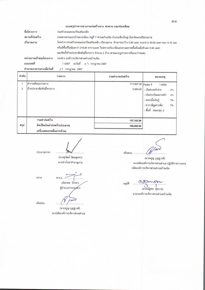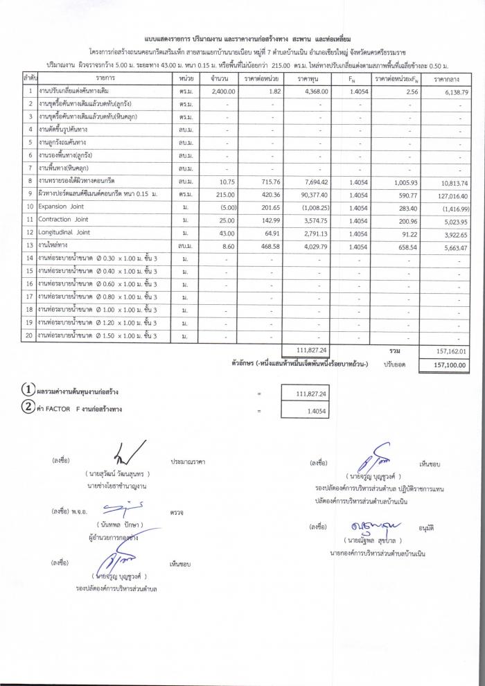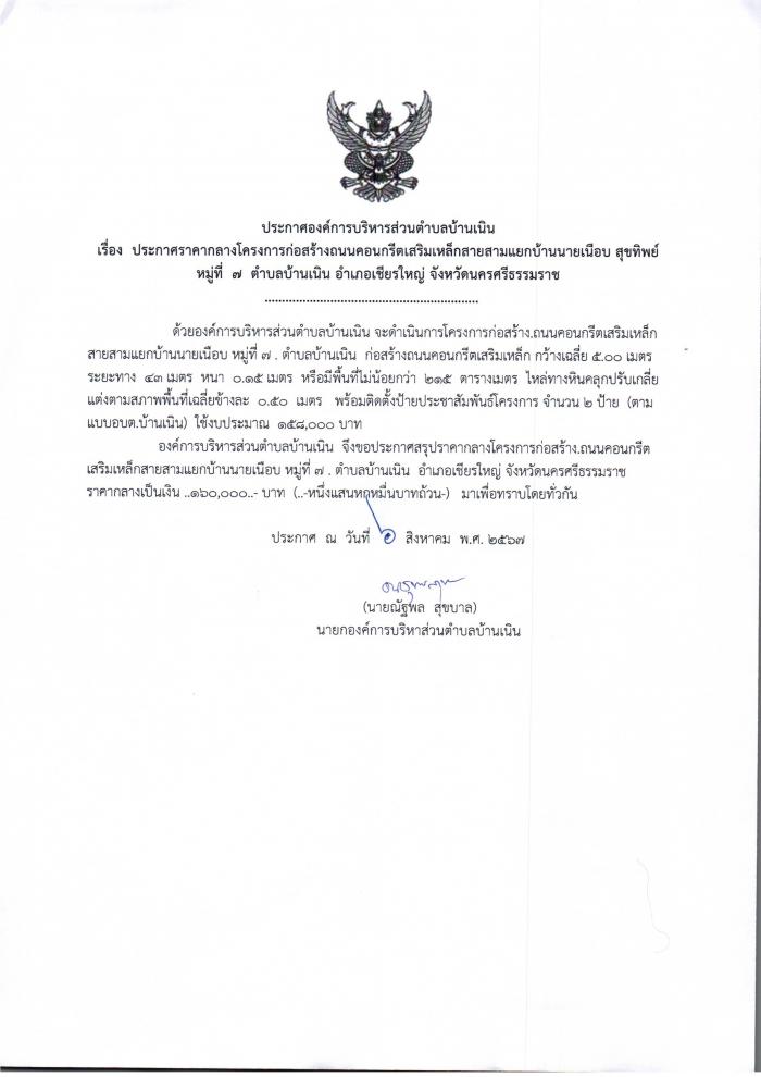 ประกาศราคากลางก่อสร้างถนนคสล.สายสามแยกบ้านนายเนือบ หมู่ที่๗ ต.บ้านเนิน