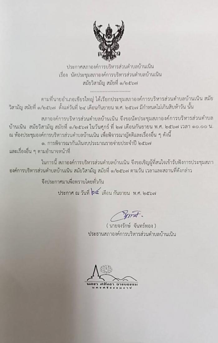 นัดประชุมสภา อบต.บ้านเนิน สมัยวิสามัญ สมัยที่ 1/2567