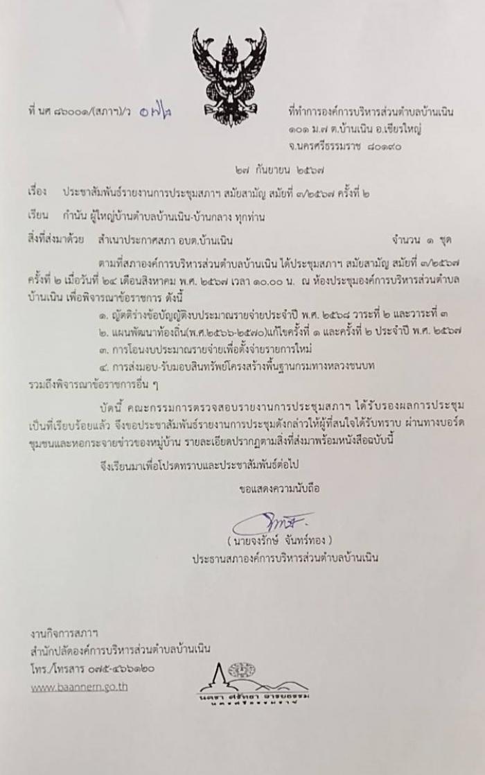 ประชาสัมพันธ์รายงานการประชุมสภา อบต.บ้านเนิน สมัยสามัญ สมัยที่ 3/2567 ครั้งที่ 2
