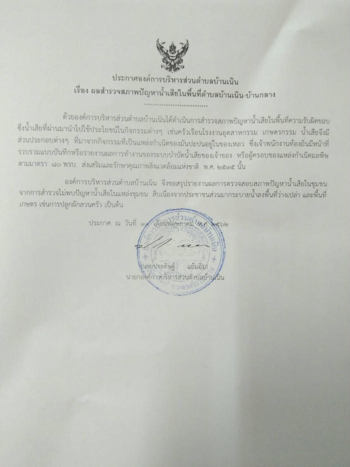 ประชาสัมพันธ์ผลสำรวจปัญหาน้ำเสียในพื้นที่ตำบลบ้านเนิน-บ้านกลาง