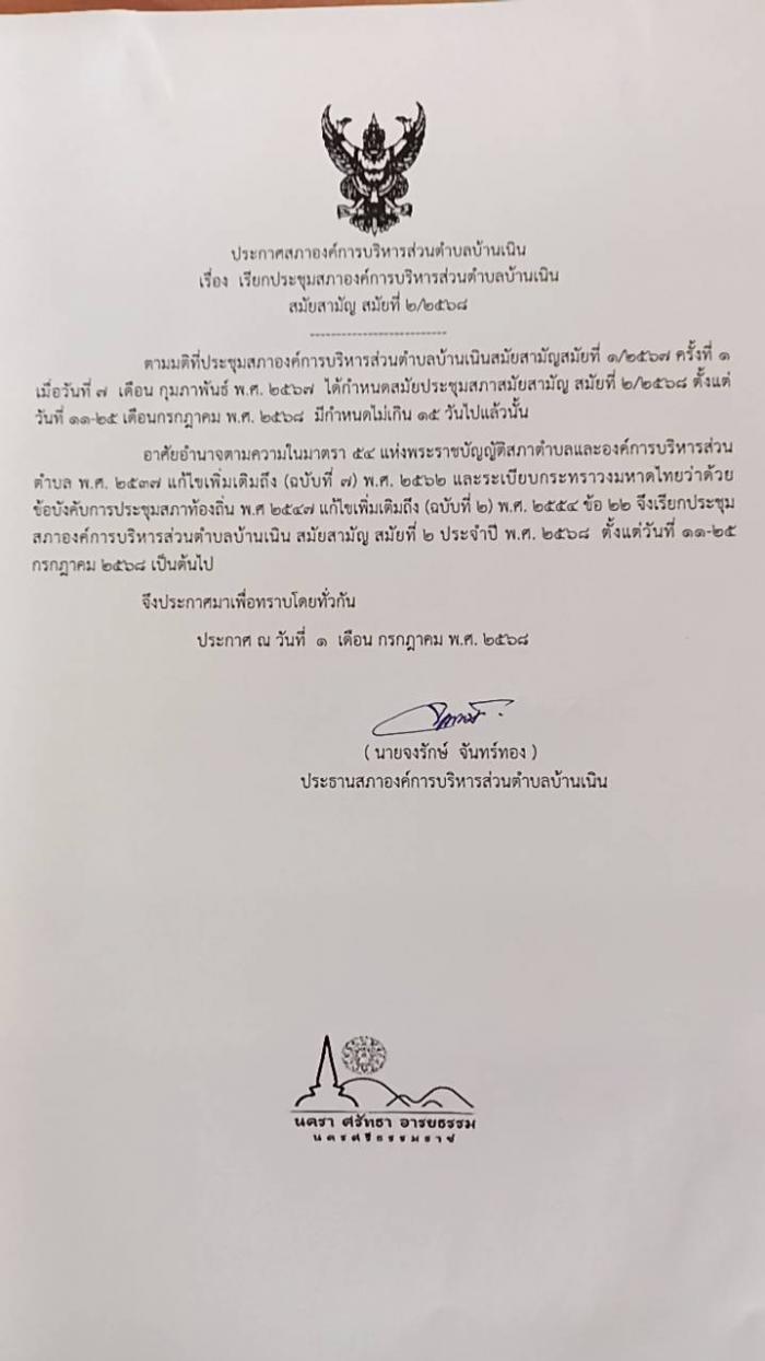 เรียกประชุมสภา อบต.บ้านเนิน สมัยสามัญ สมัญที่ 2/2568