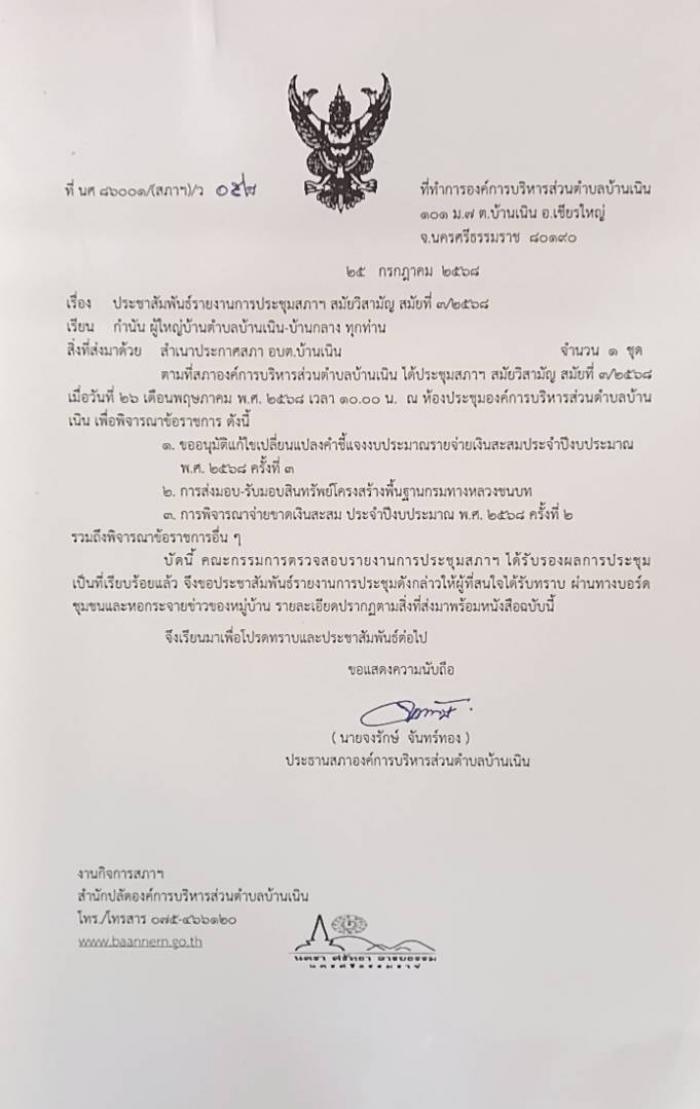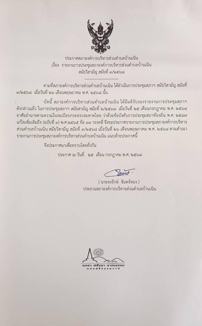 ประชาสัมพันธ์รายงานการประชุมสภา อบต.บ้านเนิน สมัยวิสามัญ สมัยที่ 3/2568