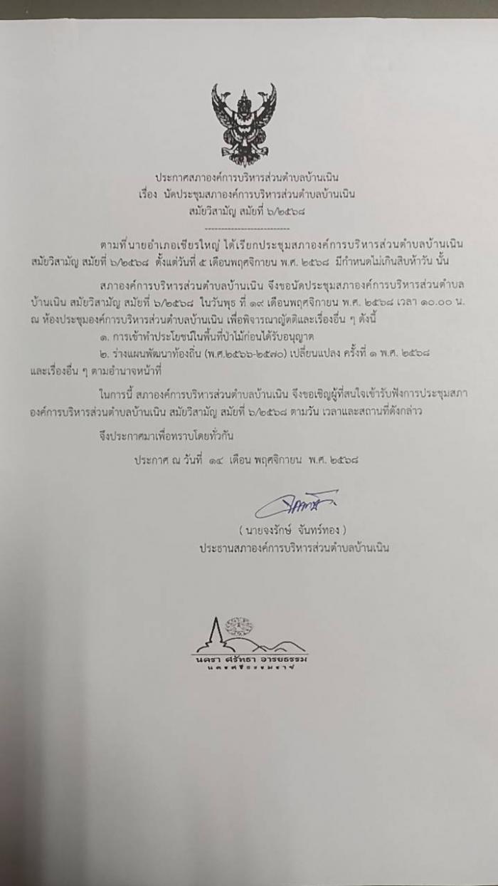 นัดประชุมสภา อบต.บ้านเนิน สมัยวิสามัญ สมัยที่ 6/2568