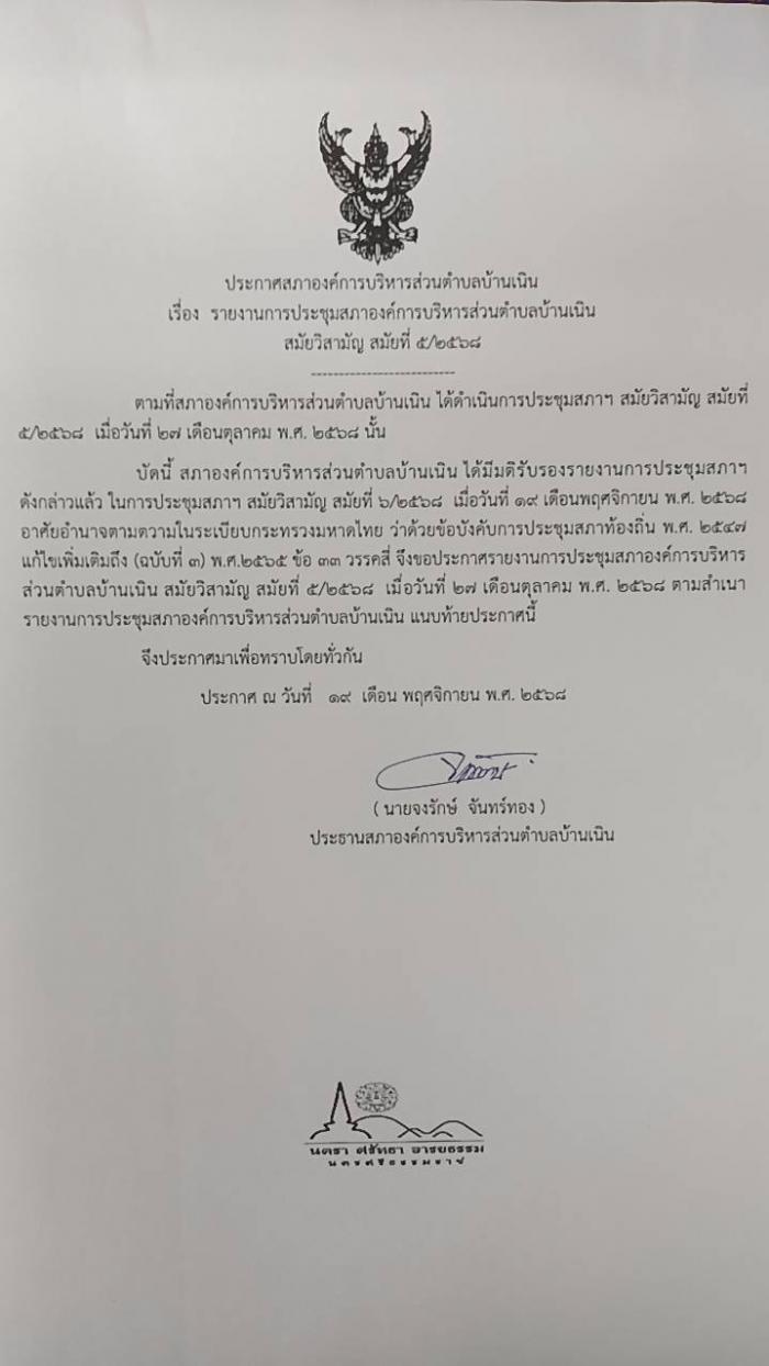 ประชาสัมพันธ์รายงานการประชุมสภา อบต.บ้านเนิน สมัยวิสามัญ สมัยที่ 5/2568