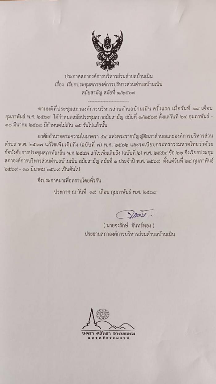 เรียกประชุมสภา อบต.บ้านเนิน สมัยสามัญ สมัยที่ 1/2569 ครั้งที่ 1