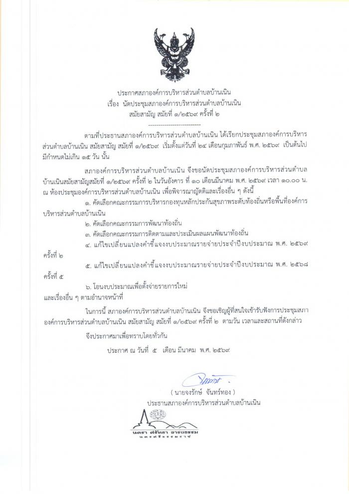 นัดประชุมสภา อบต.บ้านเนิน สมัยสามัญ สมัยที่ 1/2569 ครั้งที่ 2