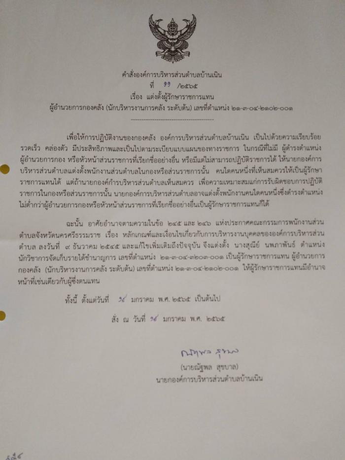 ประกาศ เรื่อง เรื่อง แต่งตั้งผู้รักษาราชการแทน ผู้อำนวยการกองคลัง (นักบริหารงานการคลัง ระดับต้น) เลขที่ตำแหน่ง ๒๑-๓-๐๔-๒๑๐๒-๐๐๑