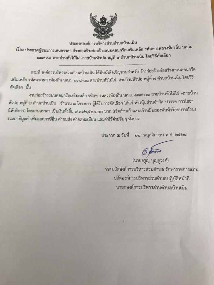ประกาศองค์การบริหารส่วนตำบลบ้านเนิน เรื่อง ประกาศผู้ชนะการเสนอราคาจ้างก่อสร้างถนนคสล.สายบ้านหัวไม้ไผ่ -บ้านหัวปอ