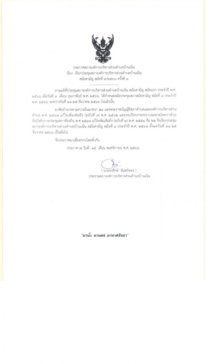 เรียกประชุมสภาองค์การบริหารส่วนตำบลบ้านเนิน สมัยสามัญ สมัยที่ 4/2566