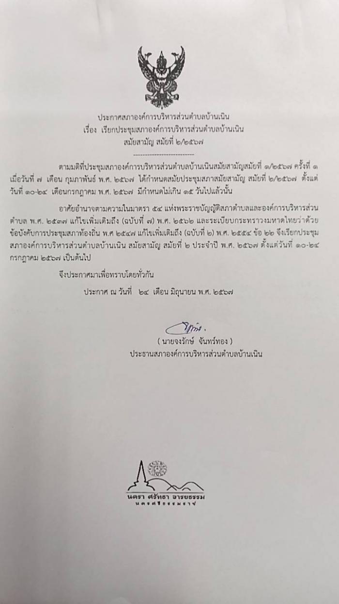เรียกประชุมสภา อบต.บ้านเนิน สมัยสามัญ สมัยที่ 2/2567